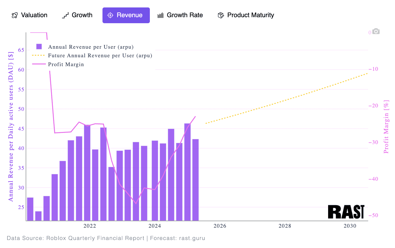 Roblox's revenue per user has been stagnating since 2022. Given their very young customerbase, it is difficult to imagine this trend changing any time soon.