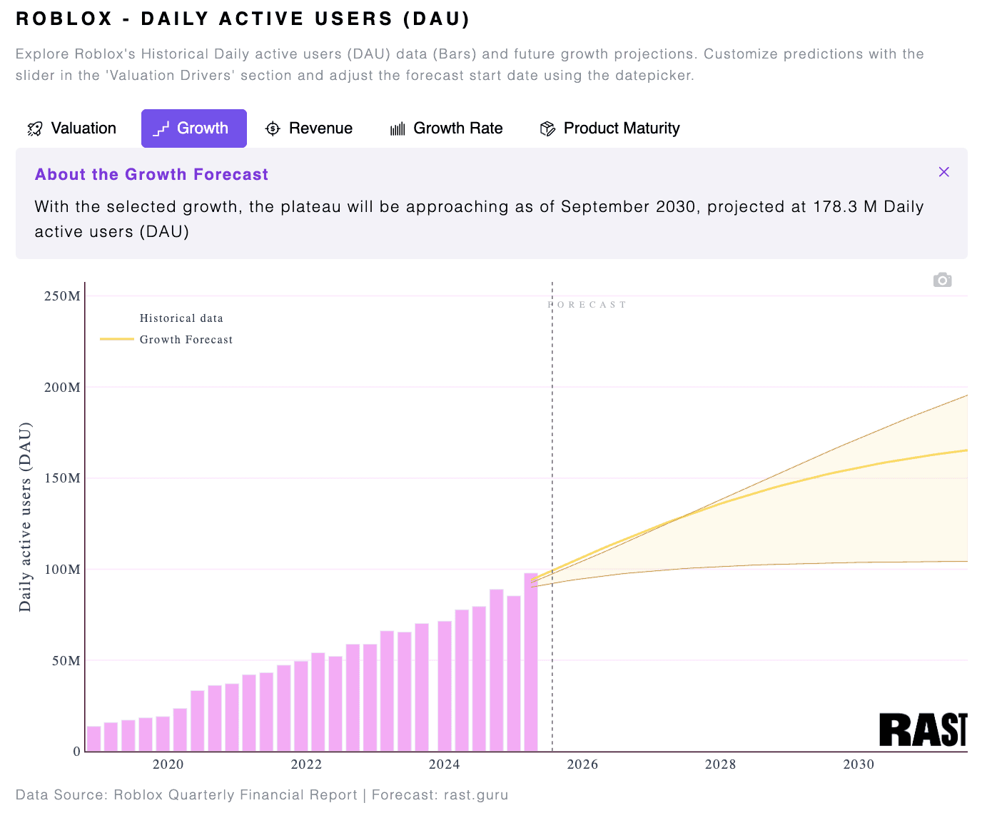 Roblox's plateau of Daily Active Users (DAU) could be reached in August 2032 with 180 M users. In the best case scenario, the growth can even further continue.